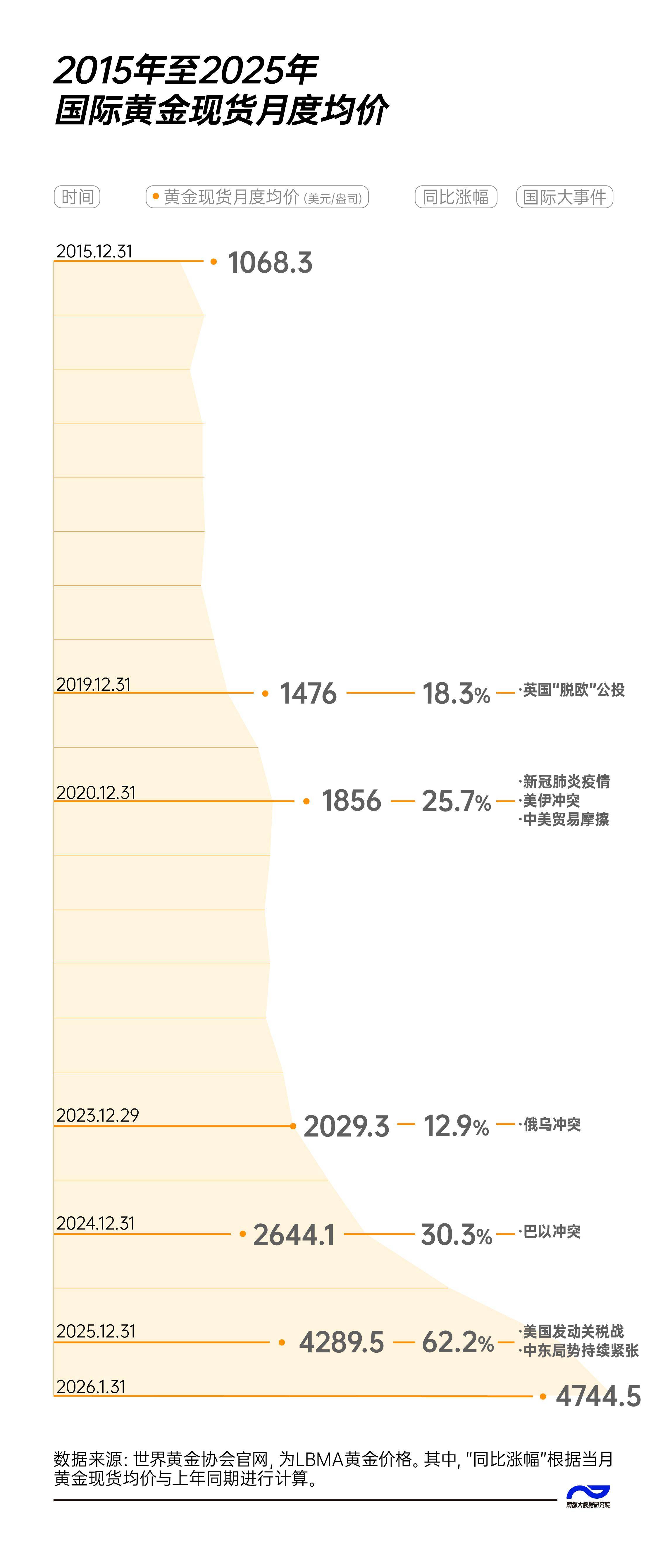 进入2026年,黄金价格继续“狂飙”。2026年1月底,国际现货金价突破5500美元/盎司关口,尽管后续经历价格急坠,但很快又回升至每盎司5000美元上方。